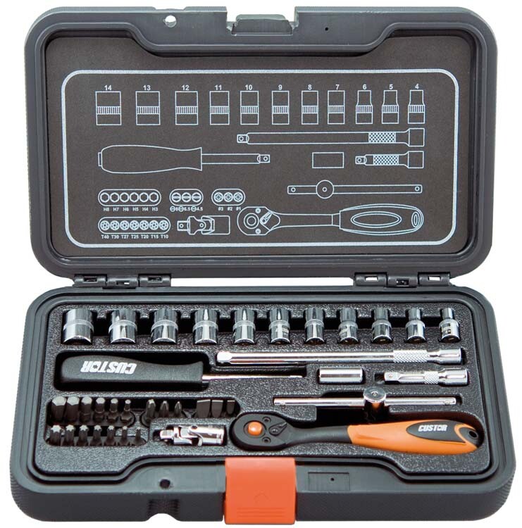 Ratel, korte doppen 4 t/m 14mm, T-handle, verlengstukken 50+150mm, schroevendraaier bithouder, kniestuk, bithouder, bits PH1, PH2, PH3, T10, T15, T20, T25, T27, T30, T40, H3, H4, H5, H6, H7, H8, plat 4.5, 6.5, 8mm...