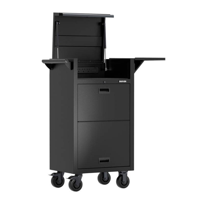 Incl. 5 laden verborgen achter twee afsluitbare deuren. De bovenklep is afsluitbaar. Ook voorzien van inklapbaar zijvak voor bv de laptop. Voorzien van zwenkwielen waarvan 2 met rem.
