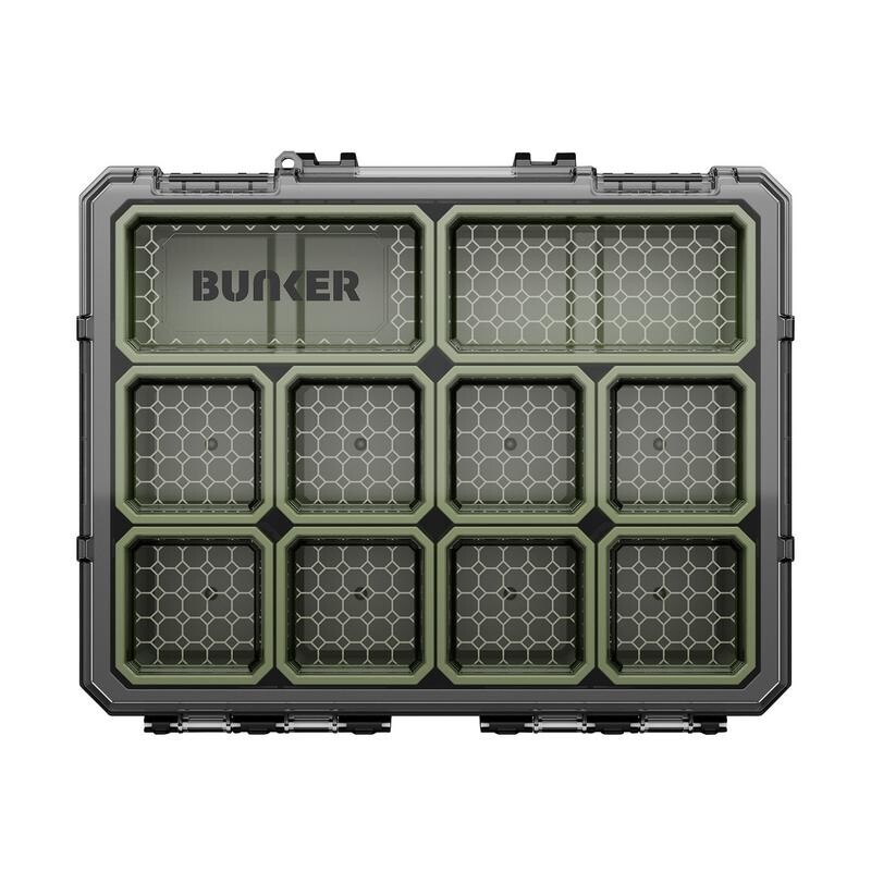 Compacte BUNKER opbergbak met 20 uitneembare bakjes voor overzichtelijke opslag van gereedschap en kleine onderdelen. Voorzien van een schokbestendige constructie, transparant deksel en stevige sluiting, zodat de inhoud zichtbaar en veilig opgeborgen blijft.Niet compatibel met het BUNKER Load-Up assortiment.