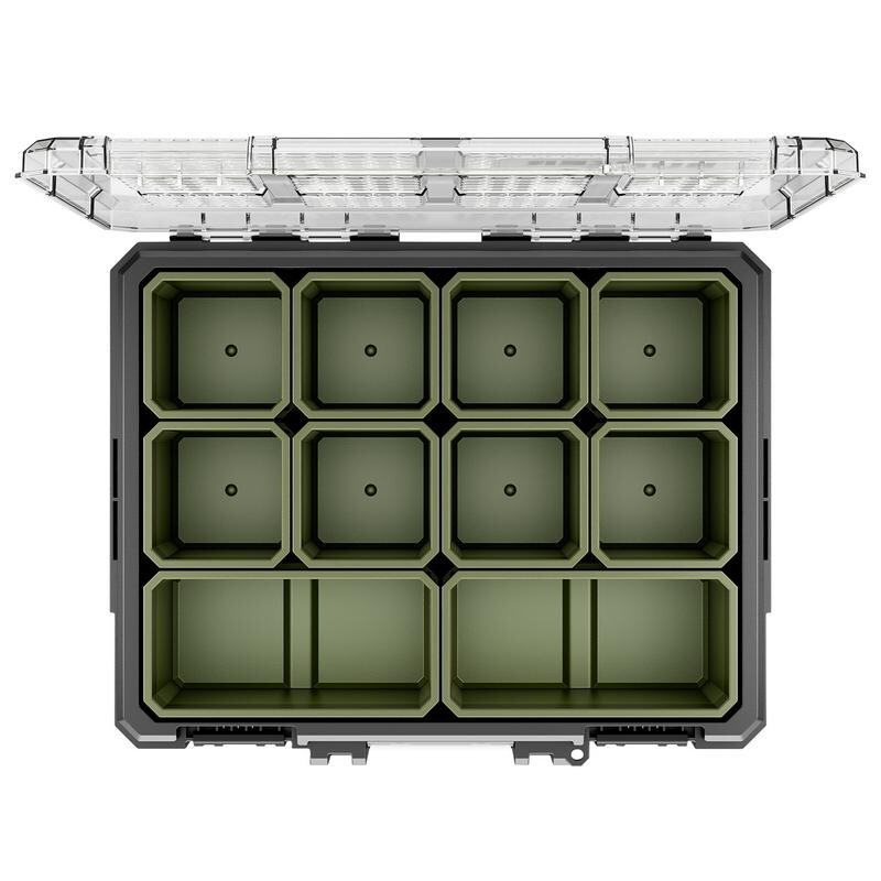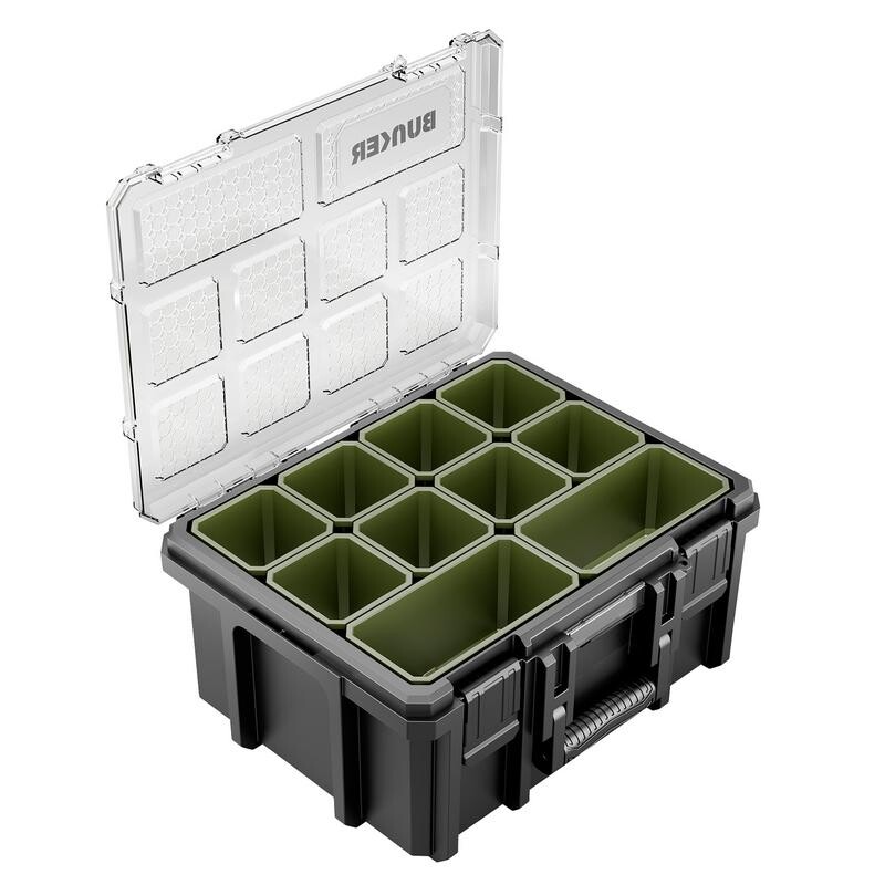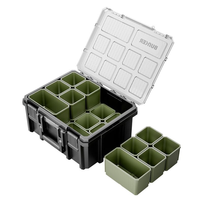 Compacte BUNKER opbergbak met 20 uitneembare bakjes voor overzichtelijke opslag van gereedschap en kleine onderdelen. Voorzien van een schokbestendige constructie, transparant deksel en stevige sluiting, zodat de inhoud zichtbaar en veilig opgeborgen blijft.