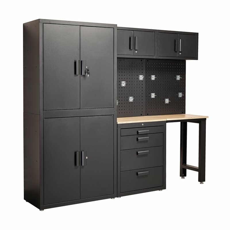 Deze complete werkplaatsinrichting combineert één hoge kast met vier deuren en drie vaste legplanken, twee wandkasten, een onderkast met vier lades en een houten werkblad. Daarnaast zijn er twee achterpanelen voor het ophangen van gereedschapen. Het geheel is uitgevoerd in een matzwarte lakafwerking en voorzien van verstelbare poten voor extra stabiliteit. Deze opbergcombinatie is af te sluiten met de zes meegeleverde sleutels.Totale afmetingen: (227,5x45,8x190 cm)