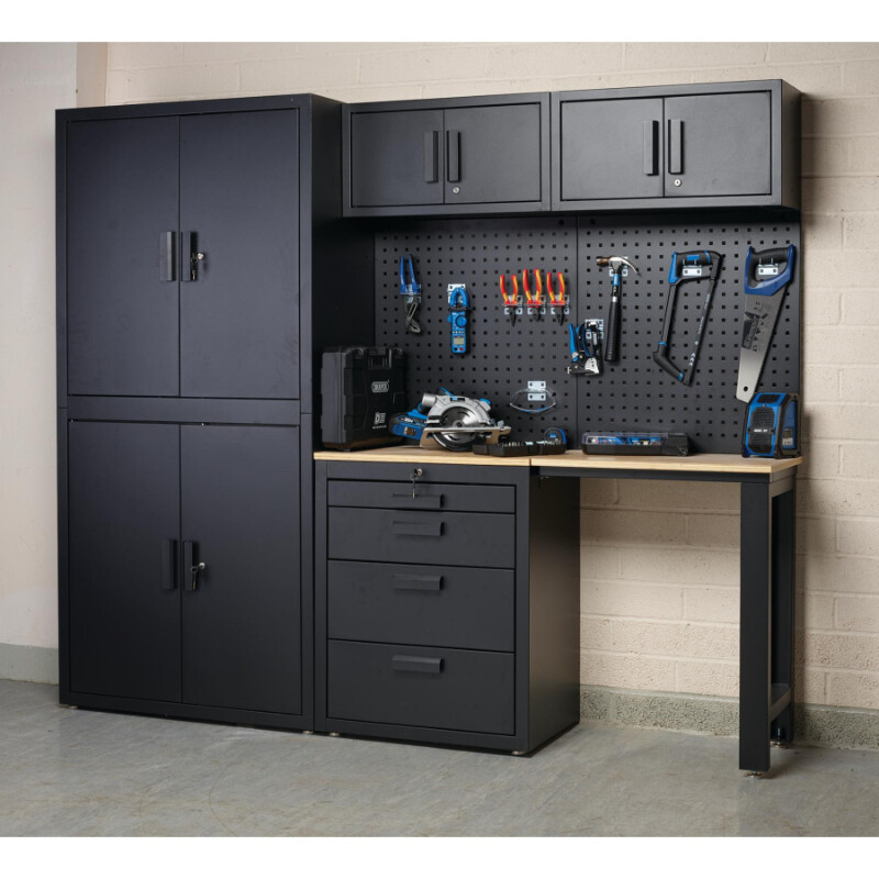 Deze complete werkplaatsinrichting combineert één hoge kast met vier deuren en drie vaste legplanken, twee wandkasten, een onderkast met vier lades en een houten werkblad. Daarnaast zijn er twee achterpanelen voor het ophangen van gereedschapen. Het geheel is uitgevoerd in een matzwarte lakafwerking...