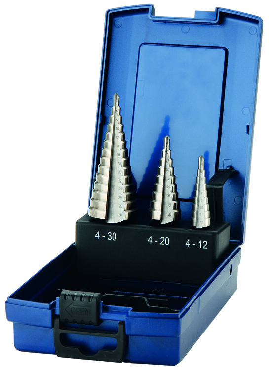 HSS, voor het boren van grotere gaten in dun materiaal zoals plaatwerk alsmede het verruimen van bestaande gaten in staal en RVS tot 2mm, nonn ferro tot 5mm.Inhoud: 4-12mm, 4-20mm, 4-30mm